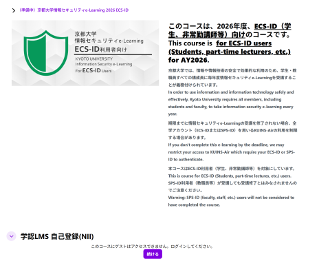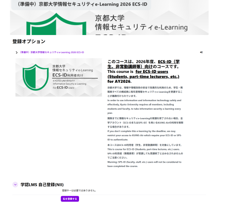 情報セキュリティe-LearningはECS-ID(学生、非常勤講師等)向けと、SPS-ID(教職員等)向けの2コース用意されています。ご自身の全学アカウントの種別に対応したe-Learningを受講してください。異なるコースを受講した場合、受講修了扱いされない可能性があります。